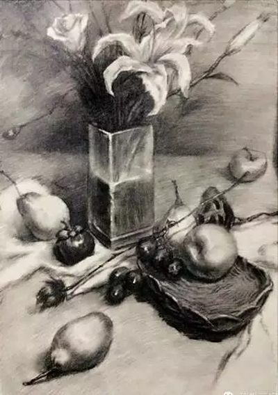 面對(duì)一組靜物中所有的物體,我們是否要面面俱到,照搬照抄呢?藝術(shù)來源于自然而高于自然,照相寫實(shí)有一定的局限性。尊重實(shí)際,發(fā)揮主觀能動(dòng)性才是藝術(shù)的最終法則。如何處理表現(xiàn)與再現(xiàn)的關(guān)系,主觀和客觀的關(guān)系,是初學(xué)者需要注意的。確立整體觀念,概括處理好畫面的主次關(guān)系,前后關(guān)系、虛實(shí)關(guān)系、空間關(guān)系等,就是主觀和客觀的統(tǒng)一。