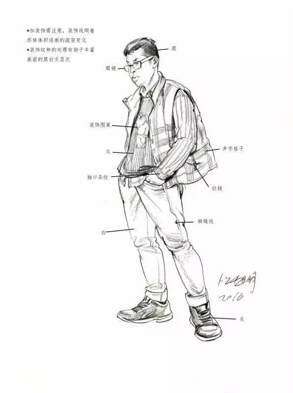 速寫的節(jié)奏就是指畫面構(gòu)成的黑白灰、人物動(dòng)態(tài)構(gòu)成的韻律關(guān)系、細(xì)節(jié)描繪與粗描淡寫的對比,有了節(jié)奏感,畫面看起來就協(xié)調(diào)了。