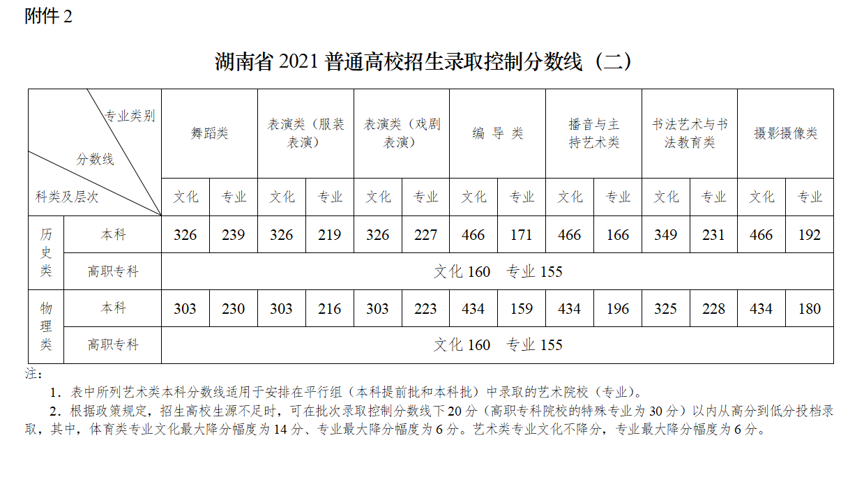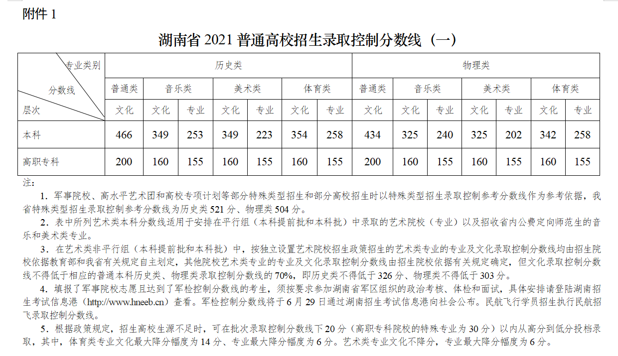 湖南省2021普通高校招生錄取控制分數線