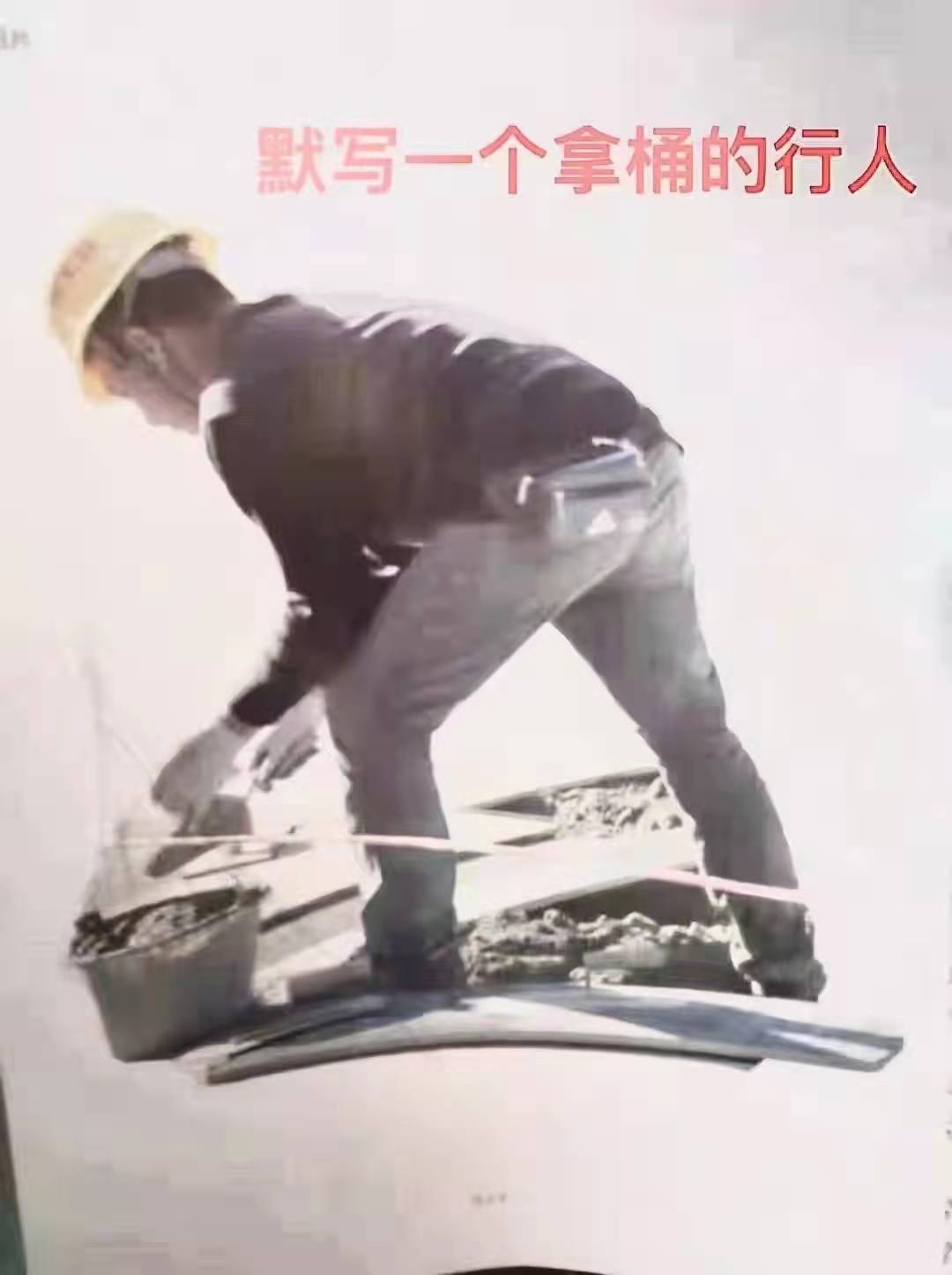速寫考題:雙人動(dòng)態(tài)組合,1個(gè)彎腰干活的泥水匠(照片)+ 1個(gè)拿桶的行人(默寫)