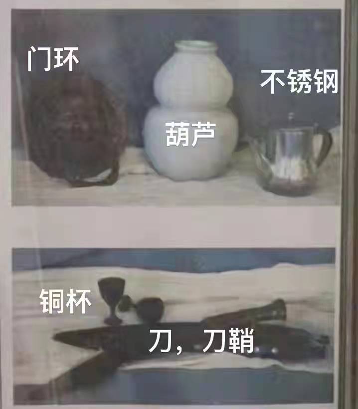 素描考題:靜物組合,照片模擬寫生,門環(huán)、葫蘆、不銹鋼、銅杯、刀、刀鞘等靜物。