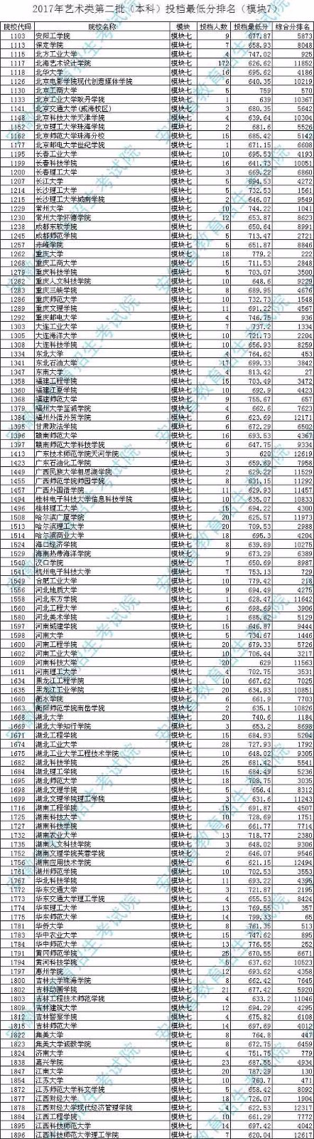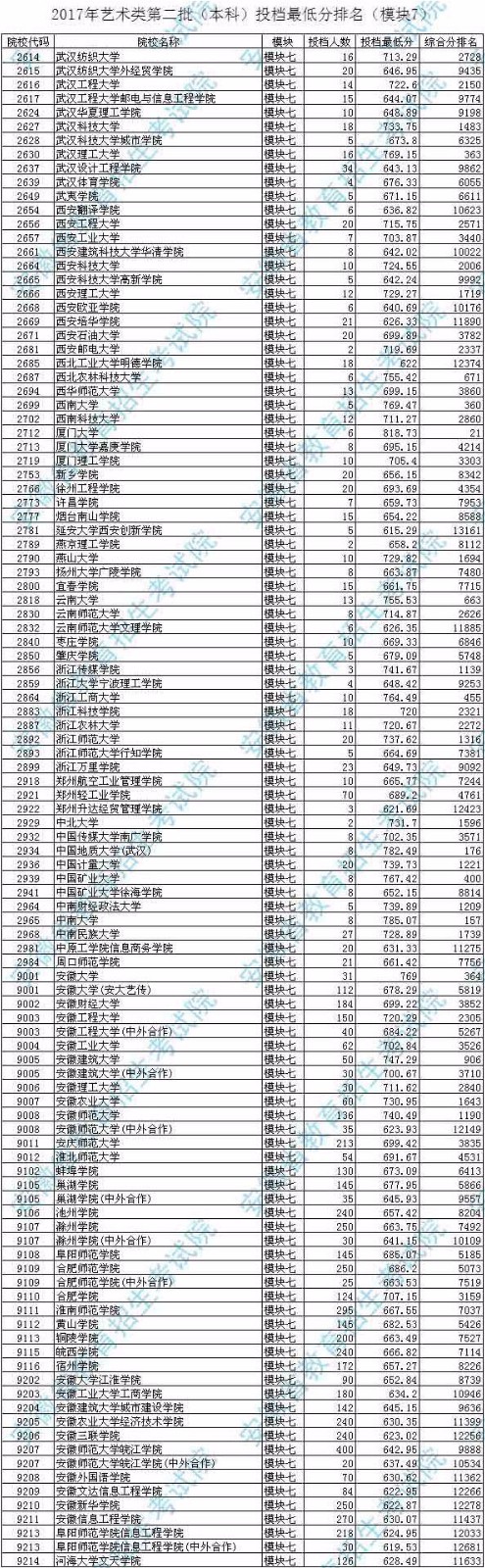 2017年承認(rèn)安徽模塊七(美術(shù)類)考成績的院校的投檔最低分排名如下: